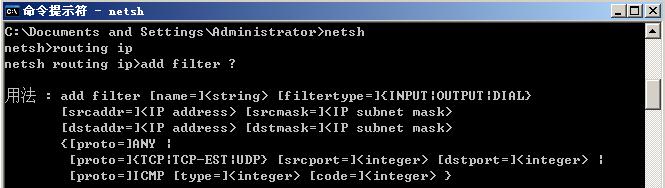 三、在命令行中设置IP筛选器1. 在命令行下可以用netsh命令来配置IP筛选器,如下图所示。输入netsh后回车,进入netsh命令后输入routing ip,便可以对路由器进行一些配置。可以输入“add filter ?”来查看添加IP筛选器的详细命令。