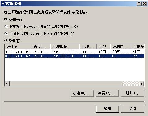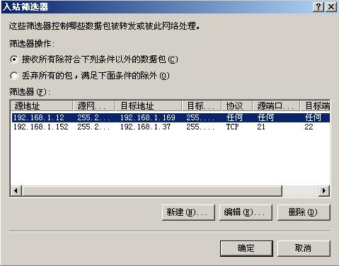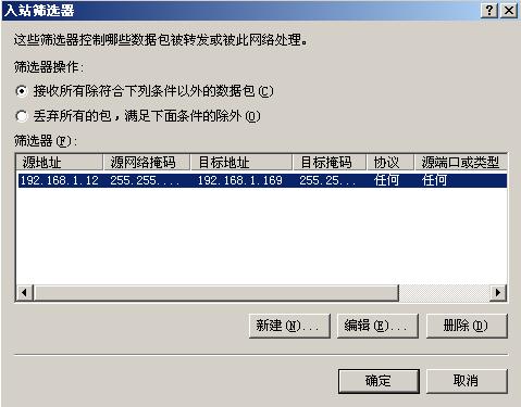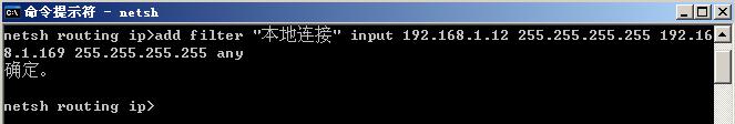 2. 在入站筛选器中添加记录的命令为:“add filter "本地连接" input 192.168.1.12 255.255.255.255 192.168.1.169 255.255.255.255 any”如下图所示。即为在名为“本地连接”的连接上添加入站筛选器,input代表添加入站筛选器,如果要添加出站筛选器,则为output,源网络的IP地址为192.168.1.12,子网掩码为255.255.255.255,目标网络的IP地址为192.168.1.169,子网掩码为255.255.255.255,协议为任何。