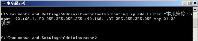 4. 此命令也可以用一条语句直接执行,直接输入命令“netsh routing ip add filter "本地连接" input 192.168.1.152 255.255.255.255 192.168.1.37 255.255.255.255 tcp 21 22”,如下图所示。