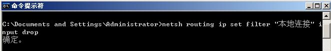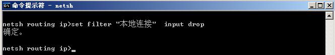9. 此命令也可以用一条语句直接执行,命令为“netsh routing ip set filter "本地连接" input drop”,如下图所示。
