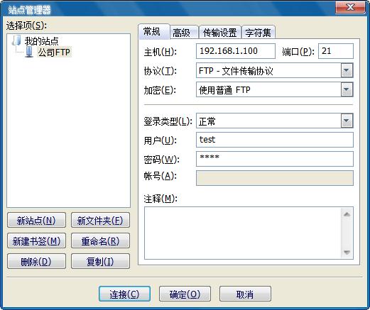 以后访问FTP,就只需连接站点“公司FTP”。