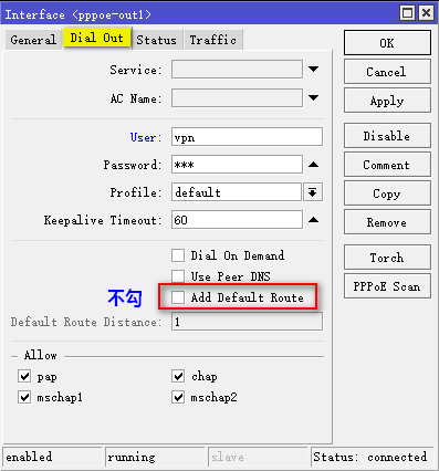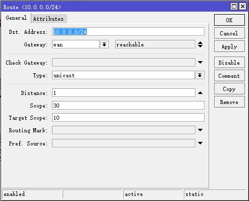 至此完成路由器B到路由器A的PPPoE连接,在路由器A的 IP→PPP→Active Connections 中可以查看连接情况。 三、 两个内网相互访问 建立访问对方内网的路由规则:进入IP→Routes,新建路由