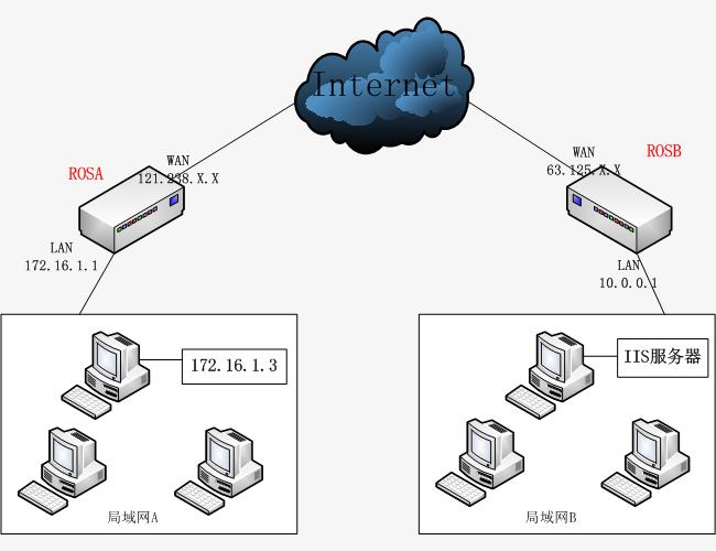 公司分处两地办公,两处都有一个局域网,分别都可以通过电信的宽带连接Internet。现在希望两个局域网通过公网建立VPN互联互通,各终端之间实现完全透明的访问。局域网B中的IIS服务器应能记录来访内网的真实IP地址。 要求: 1. 两地局域网都能上外网; 方案: 以MikroTik ROS 6.19为例, 环境: 局域网A 局域网B