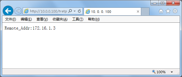 设置完成后,从局域网A中的172.16.1.3的机器上访问局域网B中的IIS服务器,可以查看到其“Remote_Addr”为局域网A的路由器地址“172.16.1.1”,而不是访问机器的真实内网地址。如果需要查看到访问机器的真实地址,还需要做第四步的设置。