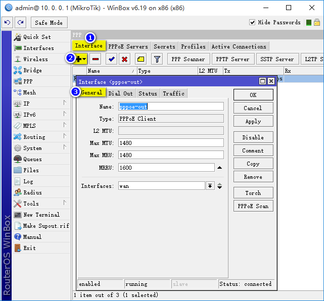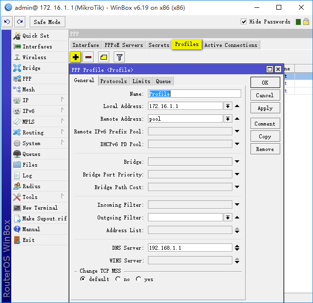 2. 路由器B架设PPPoE Client 用WinBox登陆路由器B,进入PPP