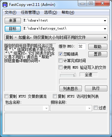 有的用户在文件服务器上并没有安装加密软件,但用户上传至文件服务器的文件都是加密的,加密文件的移动复制都必须在加密环境下进行,这种情况下如何对服务器上的文件进行备份?现提供了以下两种方案,用户可以根据情况选择合适自己的方法。 注意:所有的备份都需要以文件夹为单位来进行操作,切勿在备份对象的最外层含有加密文件。 1、 fastcopy备份 fastcopy备份时最为推荐的方法。Fastcopy在复制文件时可以正确的复制加密数据库,保证文件的加密信息不丢失。操作也很简单,选择好来源和目标地址后,点击“执行”按钮即可。