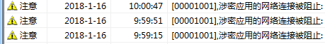 比较常见的有以下几种阻止的动作类型 1、 涉密后通信被阻止 应用涉密后如果想和其他机器进行网络通讯会被加密阻止,在日志中会记录如下信息,提示涉密应用的网络连接被阻止,还会详细记录涉密进程以及想要通讯的IP地址和端口号等内容。