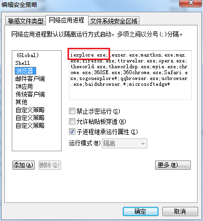 如果确实需要使用这些默认隔离的应用去访问涉密的地址,首先应该把这些应用改为涉密运行,只要在网络应用进程中删除对应的进程名即可。例如:将IE设置为涉密运行,用来访问加密的数据。 进入集控服务管理器,选择“文件”→“编辑安全策略”→“全局策略”→“网络应用进程”→“浏览器”,找到IE的进程“iexplore.exe”,将其删除后点击确定即可。