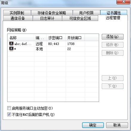 3、选择“远程管理”,点击“添加”按钮,新增一条网络策略