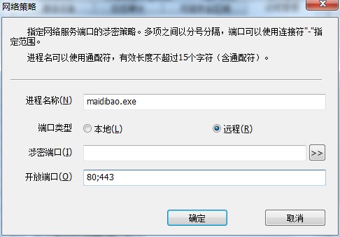 4、进程名称输入“maidibao.exe”,端口类型选择远程,开放端口填写80和443,用“;”分隔,如下图所示,填写好后,点击确定按钮。