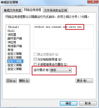 3、在网络应用进程中,添加一条自定义策略,在右侧添加进程“csrss.exe”,运行模式选择“特权”,设置好后点击确定按钮。