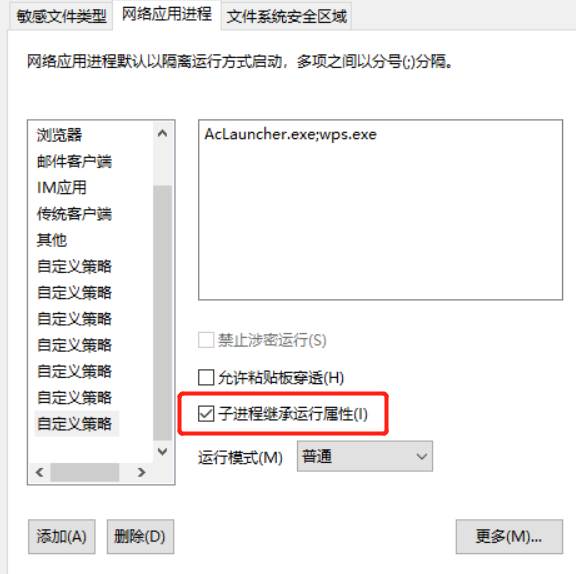 3) 隔离打开保存文档不受敏感文件的限制。 部分软件在关联文档时使用总的调度进程,而实际打开文档的应用并不是这个关联的应用,这种情况可能会导致隔离打开失败,文档打开后仍然处于涉密状态。这种情况可以设置一条自定义策略,把软件的调度进程设置为“子进程继承运行属性”即可。以AutoCAD和WPS为例,高版本的AutoCAD软件的调度进程是AcLauncher.exe,WPS软件的调度进程是wps.exe。