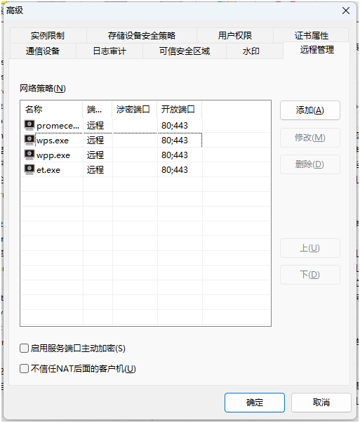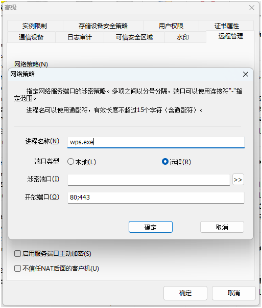 加密环境中WPS在涉密后互联网连接默认被切断,导致无法登录WPS账户和使用云端AI,管理员可通过以下设置开放WPS在涉密环境中的登录和AI使用限制。 一、登录WPS账号设置 WPS应用涉密后,会无法登录WPS账号,导致WPS功能无法使用。此问题是由于进程promecefpluginhost.exe涉密后无法联网引起的,需要在加密用户的高级权限“远程管理”中添加设置,将此进程的联网权限放开即可。 进入集控服务管理器,双击加密用户,选择“高级”→“远程管理”→“添加”,如下图所示。 进程名称:promecefplugin*(有效长度不能超过15个字符)