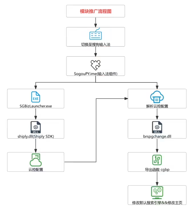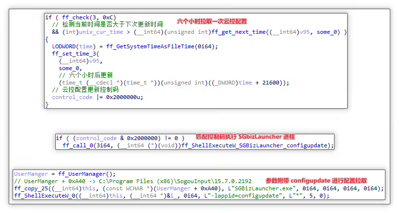 1、样本分析 本文提及的搜狗输入法版本为 15.7.0.2192。 1.1、云控配置获取与推广模块下载 配置拉取源头:搜狗输入法将会借助 SGBizLauncher.exe 程序附加参数 -lappid=configupdate 进行拉取云控配置,该 SGBizLauncher.exe 程序会被输入法组件 SogouPY.ime 执行,执行间隔为六个小时一次。此输入法组件为 DLL 文件,将会通过用户切换至搜狗输入法时被加载。