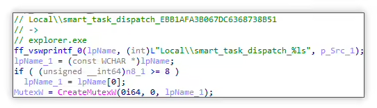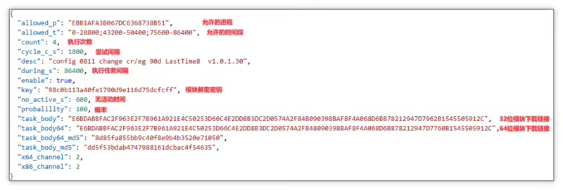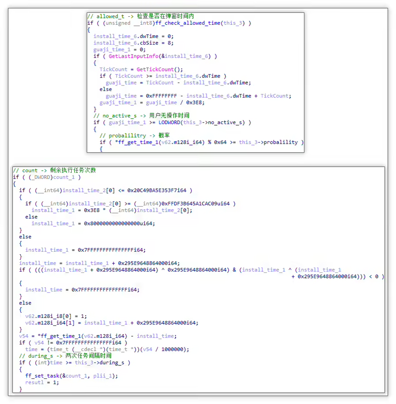 进入任务前判断阶段: 1.首先,读取 HKEY_CURRENT_USER\SOFTWARE\SystemTask 项中的 task__{allowed_p} 键。若该键存在,则读取其中的 let_{上次任务执行时间} 和 remain_{剩余任务执行次数},以供后续检测使用。 2.检查当前时间段是否在 allowed_t(允许执行任务时间段)内,根据云控配置(0-28800;43200-50400;75600-86400)所示,时间段分别为 21:00-次日 8:00、12:00-14:00,估测是规避工作时间,避免被技术人员复现该现象。 3.借助 GetLastInputInfo 函数检测用户无操作时间是否超过 no_active_s(无操作时间)的情况。 4.时间为随机数并除以 100 来获取余数,来判断该余数是否> probalility(概率)。 5.检测剩余执行任务次数是否>0。 6.检测当前时间与上次任务执行时间的间隔是否>during_s(任务执行间隔)。 7.最后将任务信息保存至注册表,并开始执行任务。