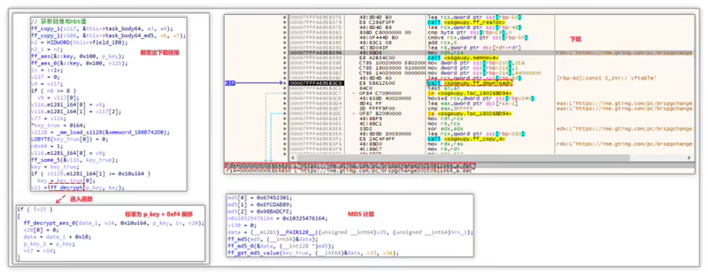 ▲ 任务信息保存至注册表 下载推广模块:任务开始后首先解密 task_body64 字段值(该解密算法采用的是 AES 算法并搭配非标准密钥流),获取到下载链接:https://ime.gtimg.com/ pc / brspgchange20250811x64_a.dat 并开始下载,下载完毕后,运用 MD5 算法计算所得 MD5 值,并与