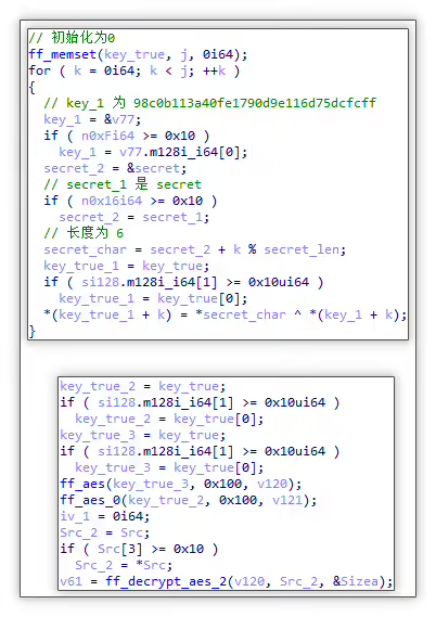 ▲ 下载并计算 MD5 值 解密推广模块:下载到的 brspgchange20250811x64_a.dat 文件经过加密处理,其解密需运用云控配置中的 key(98c0b113a40fe1790d9e116d75dcfcff)与字符串 "secret" 异或出新的 key,随后以该新的 key 为密钥,采用 AES 算法 CBC 模式进行解密。
