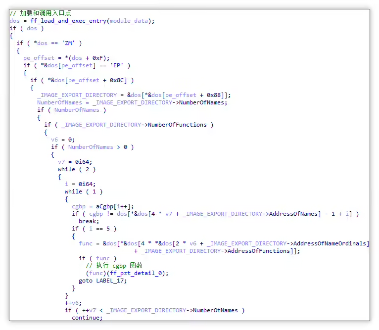 ▲ 异或出新的密钥再采用 AES 算法解密 试图下载新的推广模块:因下载链接有一定的规律,尝试将日期改成 9 月 10 日(即 brspgchange20250910),发现可以下载并且密钥与上次云控配置中的密钥一致,推测此推广模式将会长期持续,新的推广模块将会在下文《推广模块分析》中介绍。 加载推广模块并调用入口点和 cgbp 导出函数:随后,将解密后的推广模块以手动加载的方式载入内存。在完成检查 PE 头、进行 Section 映射、开展重定位处理、修复导入表以及修改 Section 权限等操作之后,会调用模块入口点以进行初始化。之后,通过遍历导出函数的方式获取 cgbp 导出函数地址,并调用该函数,由此进入推广模块的主要逻辑。