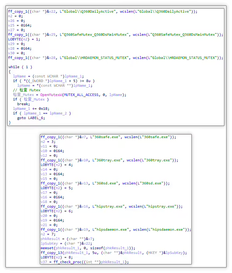 ▲ 遍历导出函数并执行 cgbp 函数 1.2、推广模块分析 检测并规避杀毒软件:借助函数 OpenMutexW 与 Process32NextW 检测本计算机中是否存在 360 或火绒的互斥体、进程名,若不存在则继续推广。