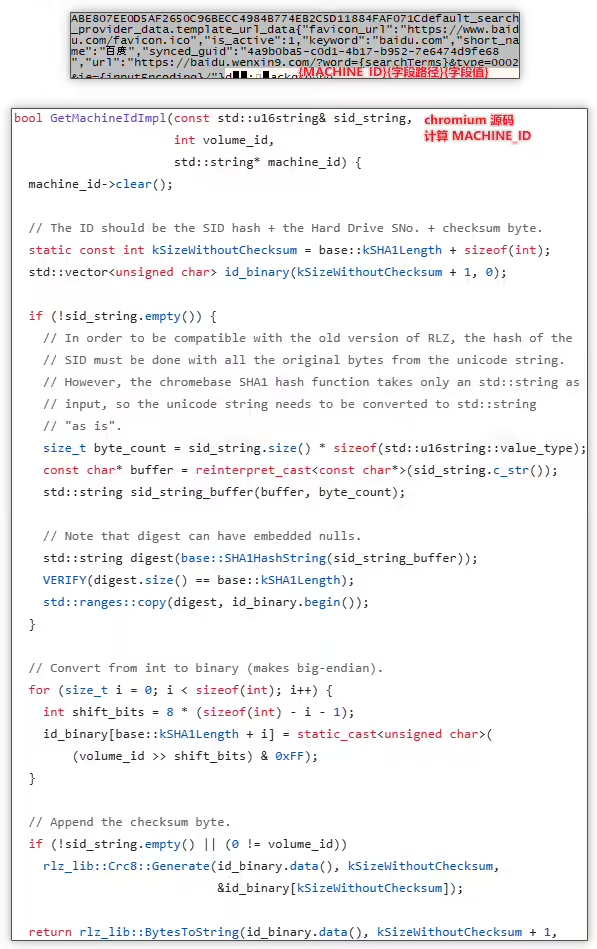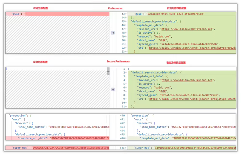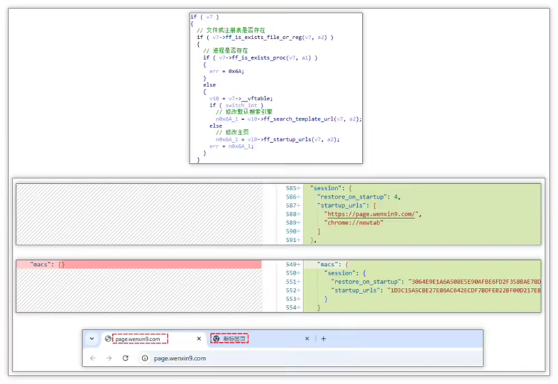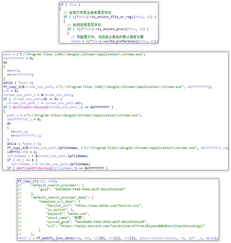 ▲ 检测互斥体与进程名 检测相应浏览器是否存在:以 Chrome 浏览器为例,将依次检测多个路径下的主程序 chrome.exe 是否存在,检测配置文件 Secure Preferences 和 Preferences 是否存在,注册表中是否有 Google Chrome 等方式。 检测相应进程是否存在:以 Chrome 浏览器为例,检测 chrome.exe 进程是否存在,仅当该进程不存在时才会进行修改操作。这是由于在 chrome.exe 处于开启状态时对配置文件进行修改,修改内容不会被保存。原因在于,关闭 chrome.exe 进程时,系统会将配置数据重新写入配置文件,进而导致配置被重置。 修改默认搜索引擎:通过写入 Preferences 与 Secure Preferences 配置文件的方式将 template_url_data 中 url 设置为 https://baidu.wenxin9.com/?word {searchTerms}&type=0002&ie={inputEncoding} 之后用户再次搜索内容时先跳转到 https://baidu.wenxin9.com/?word = 搜索内容 & type=0002&ie=UTF-8,最终跳转至 www.baidu.com/s?tn=75144485_10_dg 这类带有来源标识的链接并从中获利。