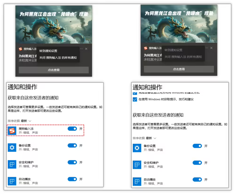 ▲ 网上用户吐槽时的拍照与截图 弹窗开关:至此可以统计出避免弹窗的方法总共有以下三种。 1.全局通知开关:Windows 系统自带设置中全局通知开关,将开关数据存储于注册表 HKEY_CURRENT_USER\SOFTWARE\Microsoft\Windows\CurrentVersion\PushNotifications 项 ToastEnabled 键值中。 2.局部搜狗输入法通知开关:系统自带设置中局部通知开关,将开关数据存储于注册表 HKEY_CURRENT_USER\SOFTWARE\Microsoft\Windows\CurrentVersion\Notifications\Settings\Sogou.Ime.SysToast.Biz 项 Enabled 键值中。 3.搜狗输入法自带开关:搜狗输入法设置中《桌面右下角推荐》选项,该选项数据将会存储于注册表 HKEY_CURRENT_USER\SOFTWARE\SogouInput.store.user 项 systoast_enable 键值中。