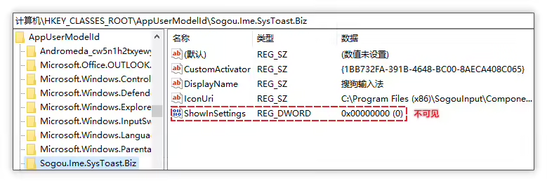 ▲ 隐藏通知设置中搜狗输入法项 隐藏原理:通过设置搜狗输入法注册表 HKEY_CLASSES_ROOT\AppUserModelId\Sogou.Ime.SysToast.Biz 项中 ShowInSettings 键值为 0 的方式,达成按钮呈灰色不可点击且在通知设置中不显示的效果。