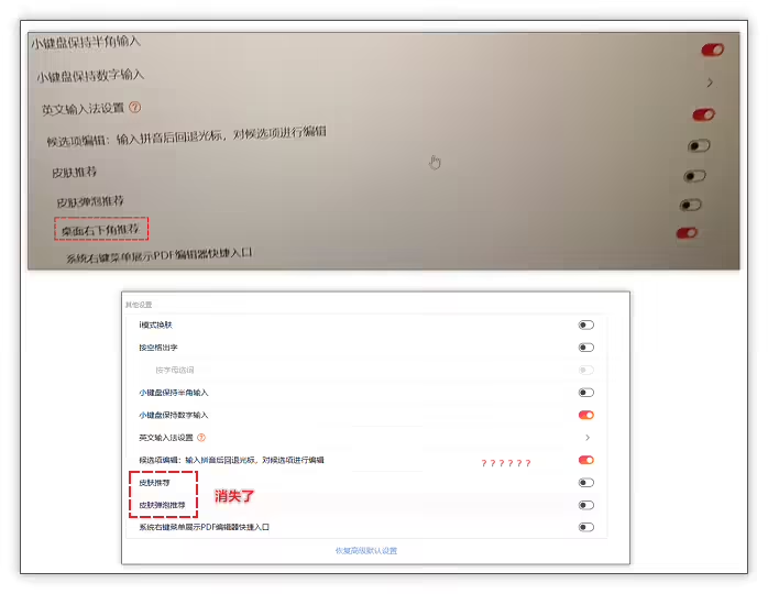 ▲ 设置隐藏 搜狗输入法设置中取消勾选:用户发现通过搜狗输入法设置中取消勾选《桌面右下角推荐》选项,想以此操作来消灭弹窗。然而一部分用户又发现该《桌面右下角推荐》选项也消失了,但在分析过程中并未成功复现,估测该行为可能是通过云控下发时针对部分目标用户精准投放所导致。