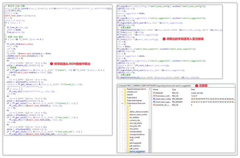 ▲ 搜狗输入法真实下发的云控配置对应的数据库图 随后从云控配置(JSON 数据)中提取数据后,将数据存储至注册表 SOFTWARE\SogouInput.store.user\search_suggestion 项中的 smart_task_config 和 smart_task_supports 键。其中,前者为提取的配置,后者为经加密处理的 allowed_p 字段,此字段代表允许的进程,即执行该任务的进程必须与 allowed_p 字段的值相符。