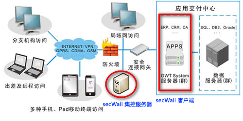 1. 在架构上添加一台secWall服务器,称之为“secWall集控服务器”,集中管理加密用户、权限和加密策略。 2. 在瑞友天翼的服务器(群)上安装“secWall企业版客户端”软件,通过登陆到secWall集控服务管理器获得加密证书,从而可以正常使用加密文件。 集控服务器在发放加密证书给客户端的同时会把加密策略同时推送给客户端,客户端按照加密策略的定义约束客户端的行为。 以上方案是根据瑞友天翼已有的拓扑结构进行无缝嵌入,如果局域网或者外网计算机有数据存储要求的,那只需在有要求的计算机上安装secWall客户端,通过加密系统来控制数据安全以及安全交互。