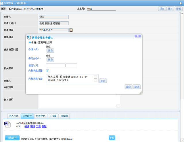 4. 表单、流程都设计好之后。普通用户需要解密文件的时候,就可以发起“解密申请”流程了。