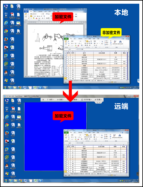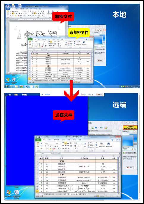 3、 远程控制 远程协助会将桌面内容发送给远程协助者,如果一刀切不允许把桌面发送给远程协助方,那么远程协助功能就完全废掉了,这在日益网络化维护管理的今天显然代价太大。如何解决远程协助和泄密的矛盾是防泄密的一个重大课题。 QQ远程和TeamViewer远程是两款较为常用的远程工具。以下分别用这两款远程工具为例来测试secWall反截屏技术是如何解决远程控制中的防泄密问题的。 QQ远程 如下图所示,在QQ远程协助时,涉密数据窗口中的内容被secWall屏蔽掉了,不涉密的的数据内容可以正常从远程窗口看到,远程协助者可以正常的控制对方的电脑,而被控制电脑的敏感数据控制者是看不到的。这种处理方式正是我们希望看到的效果,即做到敏感数据的保密,又不影响远程协助功能。远程协助者即使自己通过远程控制打开一个加密文件,也只能看到打开窗口的轮廓,但看不到窗口内显示的内容。