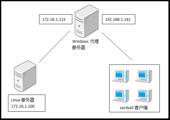 四、 不同系统互联代理服务器模式有些企业的文件服务器是Linux系统(SAMBA服务),secWall不能在Linux系统上安装,但可以通过Windows代理服务器来完成保密方案。 以Linux的SAMBA文件服务为例,SAMBA是一套使用SMB(Server Message Block)协议的应用程序, 通过支持这个协议, SAMBA允许Linux服务器与Windows系统之间进行通信,使跨平台的互访成为可能。 如下图所示部署网络架构。Window客户端不能直接访问Linux服务器,需要通过Windows代理服务器转发。