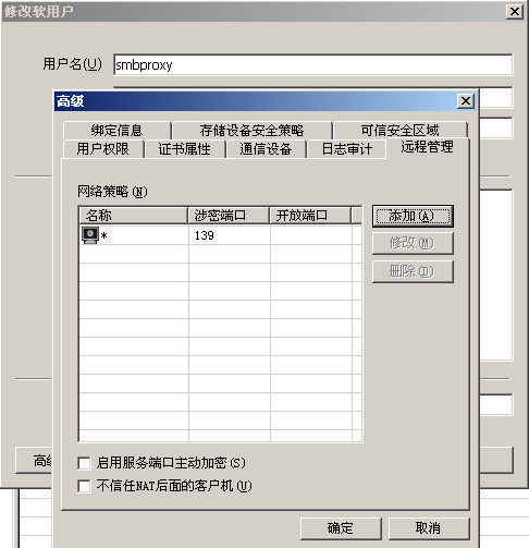 在代理上安装secWall至尊企业版,开设登录账户smbproxy,双击该用户,在“高级”→“远程管理”里中设置涉密端口。代理服务器上以这个账户登录,SAMBA的服务端口就被加密了,只有合法的secWall加密客户端才能访问SAMBA服务。