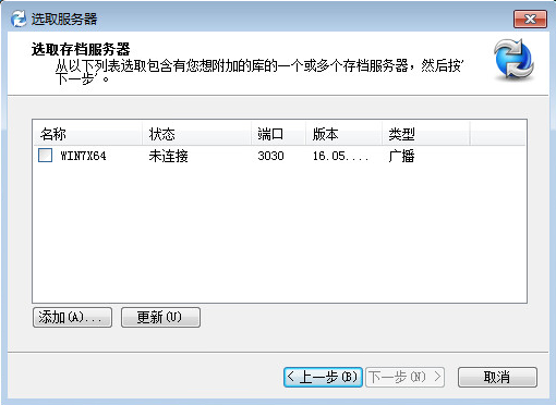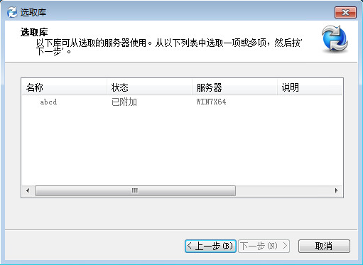 选择完存档服务器后,点击下一步,提示选择该服务器上可以附加的库。