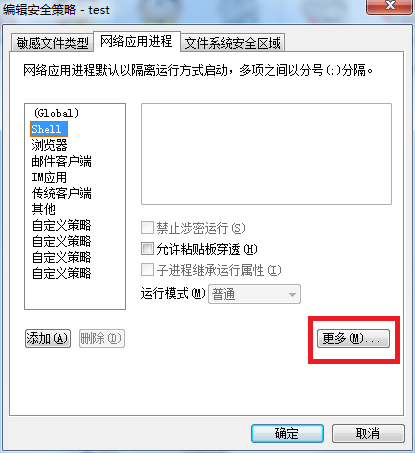 三、加密方案 由于SolidWorks PDM和资源管理器无缝集成,检出文件通过集成在Windows资源管理器中的Shell扩展模块完成。检出过程与SVN类似, 先在本地生成一个Con开头的临时文件,然后从PDM服务器获取文件的内容数据写入这个文件,最后将这个临时文件重命名为实际的文件名。 根据以上分析,我们对客户端和服务器端分别进行加密策略部署。 客户端: Shell中设置敏感文件 进入到集控服务管理器,点击“文件”→“编辑用户策略”→“网络应用进程”。选中Shell项,点击右下角的“更多”选项。