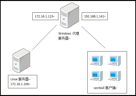 由于secWall加密系统不能直接在Linux中加密端口,在做Linux的保密方案时一般会选择设置一台代理服务器。在代理服务器上将Linux的服务端口代理出来,在代理服务器上做加密设置即可。 网络架构图如下: