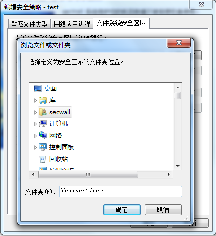 四、Samba服务1、netsh设置端口转发 C:\> netsh interface portproxy add v4tov4 listenport=139 listenaddress=192.168.1.141 connectport=139 connectaddress=172.16.1.100 139是Linux中SAMBA服务的端口。 注意如果要使用139端口代理,首先要关闭代理服务器本身的文件和打印共享服务,同时还要关闭NetBIOS,保证本地139端口不被占用。 SAMBA服务和别的服务不同的是不需要设置可信安全区域和端口加密,客户端可以直接加密服务器上的文件。 如果用户需要让上传到服务器的文件自动解密,则需要在策略中设置文件系统安全区域。 进入策略编辑后选择“文件系统安全区域”,点击“添加”按钮输入共享文件夹路径后点击确定即可。 文件系统安全区域应该和端口加密配合使用,代理服务器上应该设置Samba端口为涉密端口,防止未授权客户端直接访问Samba服务。