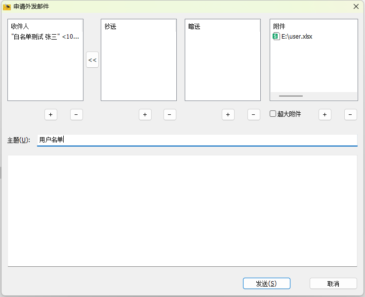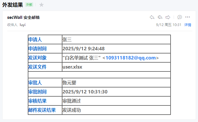外发邮件审批 3. 外发阶段 若审批通过,系统将自动将该邮件发送至外部收件人,并给申请人发送回执通知审批及外发结果。