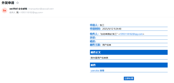 申请外发邮件 2. 审批阶段 申请提交后,系统根据预设的审批策略自动将审批任务推送至指定审批人。审批人可通过邮件通知中的链接,直接在浏览器中查看原始邮件内容、附件摘要及申请人说明,快速判断是否允许外发。