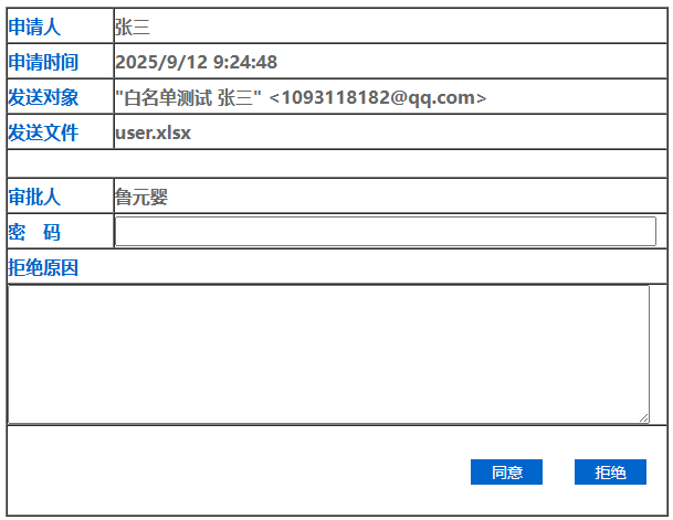 审批人收到外发邮件申请 审批操作同解密申请的相同,简便高效,支持“同意”、“拒绝”两种处理方式。所有操作均记录在案,形成完整的审计轨迹。