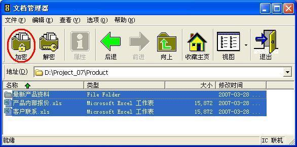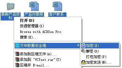 1.右键菜单 · 在Windows资源管理器选择需要加密的文档 · 按鼠标右键打开上下文菜单 · “万华数据安全墙”-->选取“加密”(图示) 注意:快捷方式、系统文件夹、应用程序不能使用“右键菜单”加密,只能用secWall 文档管理器进行加密。 2.secWall 文档管理器 · 在secWall 文档管理器中选中需要加密的文件/文件夹 · 点击工具条上的“加密”按钮(图示)