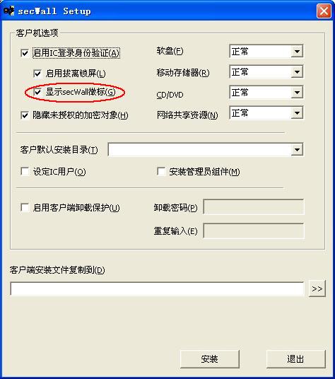 2、管理员定制安装客户端时,将“显示secwall徽标”前面的勾去掉即可(适用于专业版以上的版本)。此方法不需要关闭自动登录功能。
