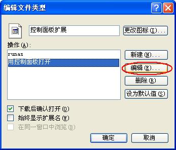 9、在“操作”列表中选择“用控制面版打开”,按“编辑”按钮。(图4)