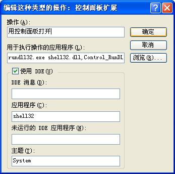 10、“操作”项内容:“用控制面板打开”; “用于执行操作的应用程序”项内容为:“rundll32.exe shell32.dll,Control_RunDLL "%1",%*”; 选择“使用DDE”项; “DDE消息”项内容为空; “应用程序”项内容为:“shell32”; “未运行的DDE应用程序”项内容为空; “主题”项内容为:“System”。(图5)