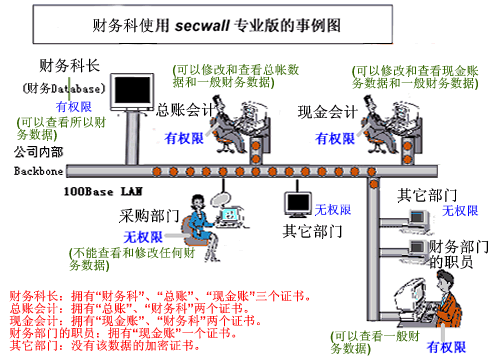 首先,财务科有一致的对外保密要求,所以首先应该有共同的部门级证书,把这个共同的证书定名为“财务科”,这个证书应该每个科员都拥有。其次,总账数据需要独立的证书,因为总账有不同于一般数据的保密要求。假设这个证书名为“总账”。再者,现金账务也需要独立的保密要求,可以给现金账务分配一个独立的证书“现金账务”。这样,总帐数据用“总账”证书保密,现金账务用“现金账务”证书保密,其他财务数据使用“财务科”数据保密。普通科员只拥有“财务科”一个证书,可以使用除总账和现金账务以外的财务数据。总账会计的Key上有“财务科”和“总账”两个证书,可以操作总帐和一般财务数据,现金数据除外。现金会计的Key上有“财务科”和“现金账务”两个证书,可以操作现金账务和一般财务数据,总账则不能操作。科长的Key上有“财务科”、“总账”、“现金账”全部三个证书,这样科长可以查看所有的财务数据。