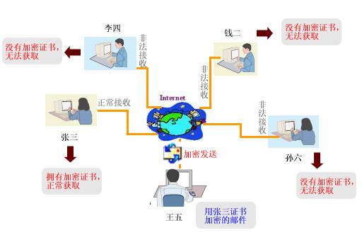 这是商务用户的典型应用。王五可以在Key上为每个不同的联系人开设不同的保密证书,如联系人张三的证书起名为“张三”,李四的证书名为“李四”等。证书名使用联系人的名称是为了便于理解和记忆,你可以使用任何喜欢的名称。王五建立完证书后把证书分发给相应的联系人。以后每次发送给张三的邮件附件都使用证书“张三”加密,发给李四的邮件附件则使用证书“李四”加密。张三和李四要想看到邮件,必须首先安装有secWall 安全系统,其次必须有王五分发给他们的加密证书。同样,不法分子即使截获了王五发送给张三或李四的邮件,也没有办法获取邮件附件的内容。