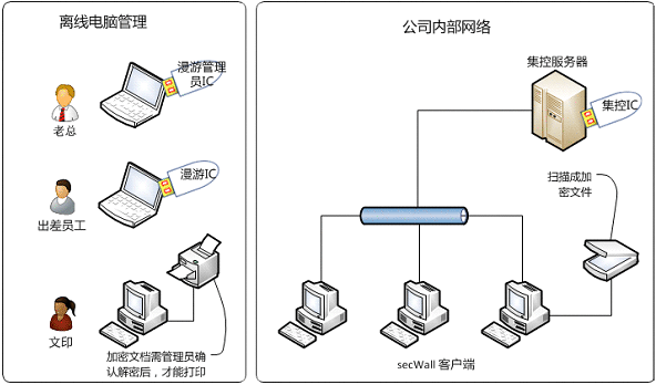 1. 在公司局域网内选择一台电脑作为集控服务器,插上集控IC,安装服务器软件。其他电脑安装客户端软件。 2. 集控服务器兼作文件服务器,不安装加密客户端。员工机密资料的共享和交流必须通过文件服务器中转。 3. 将员工电脑上现有的图纸文件、图片文件、Office文档、PDF文件加密,并将这些文件类型设为敏感文件,以后这些类型的文件无论是拷贝还是新生成,都会被主动加密。 4. 外来的图纸资料扫描成文件即被加密。 5. 只有管理员IC才能解密文档,管理员IC同样需要通过验证才能从集控服务器上获取企业通行证。 6. 软用户打印权限已经设为禁止,用户不能打印加密的资料(不影响普通文档的打印)。通洋船舶的情况有些特殊,打印由专人负责,并且不与公司网络相连。因此连接打印机的电脑不安装加密客户端,需要打印加密资料的时候,需经过管理员确认,解密后交付打印。 7. 员工出差(离开公司网络,统称为漫游)需要用到加密资料,这种情形可以通过分配“漫游IC”来解决,漫游IC自带企业通行证,和软用户一样,只能加密不能解密。为安全起见,分配漫游IC的时候,要设定时间期限以及使用密码。 8. 公司老总经常要外出交流,与客户之间的资料交换会非常频繁,交付给客户的资料要解密,新获取的资料要加密。这种情形下,可以给老总“漫游管理员IC”,这种IC具有企业通行证,可以加密解密,可以网络传输等等,拥有完全的权限。所以隐患也大,保管务必要谨慎,设定使用密码是必须的(输错3次密码IC就会被锁定,企业内部可以解锁)。漫游管理员IC也常用于异地管理。