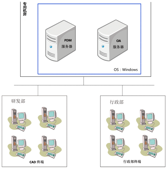 客户当前的工作环境如上图所示,技术员工的开发用终端机安装Windows操作系统,各终端机的设计图纸及相关联资源通过PDM软件同步到PDM服务器上。公司员工日常办公时需要使用OA系统。PDM/OA服务器软件分别安装在Windows机器上,所有服务器安置在专用机房。 secWall软件的部署并不需要改变用户原有的网络架构,secWall集控服务器可以安装在原有的PDM服务器上。 我们把研发部和行政部分开来解析。 由于研发部安装有CAD软件,需要接触到涉密数据,所以secWall企业版客户端将部署到每台需要使用到敏感数据的客户机,部署时加密所有敏感数据,以后的新生数据会由主动加密特征自动加密。通过用户权限中绑定的安全区域设定,从PDM服务器上下载的产品资料文件到达客户机时会自动加密。 在集控服务器端也安装secWall客户端并设置端口加密,任何没有安装secWall客户端的终端将无法访问PDM服务器。通过授权的终端从PDM的任何环节获得的数据都会被加密,这些加密的数据在公司内部可以自由流转,出了公司即失效。 行政部日常办公之需要使用OA,并不会接触到PDM系统等保密资料,所以不需要做另外的设置。